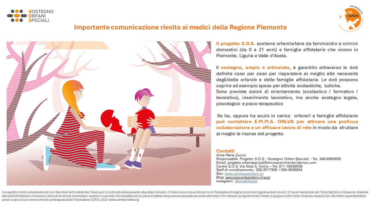 Il progetto S.O.S. sostiene orfani/orfane da femmicidio e crimini domestici (da 0 a 21 anni) e famiglie affidatarie che vivono in Piemonte, Liguria e Valle d'Aosta.